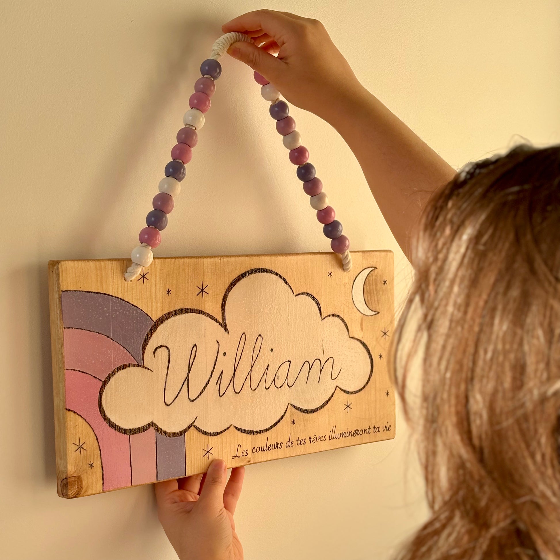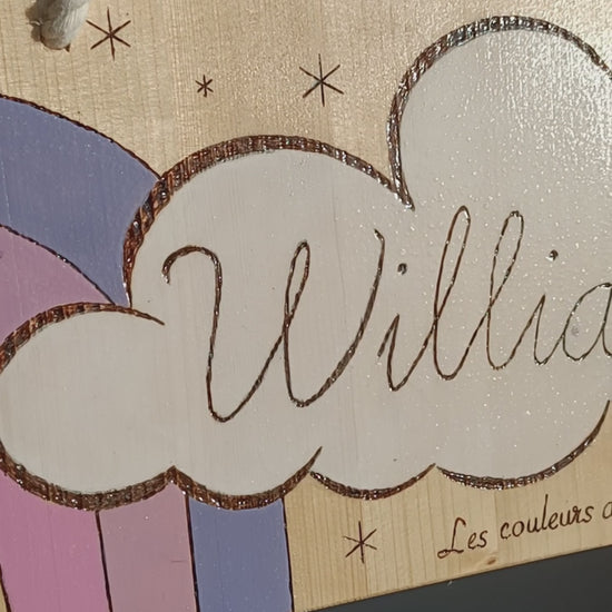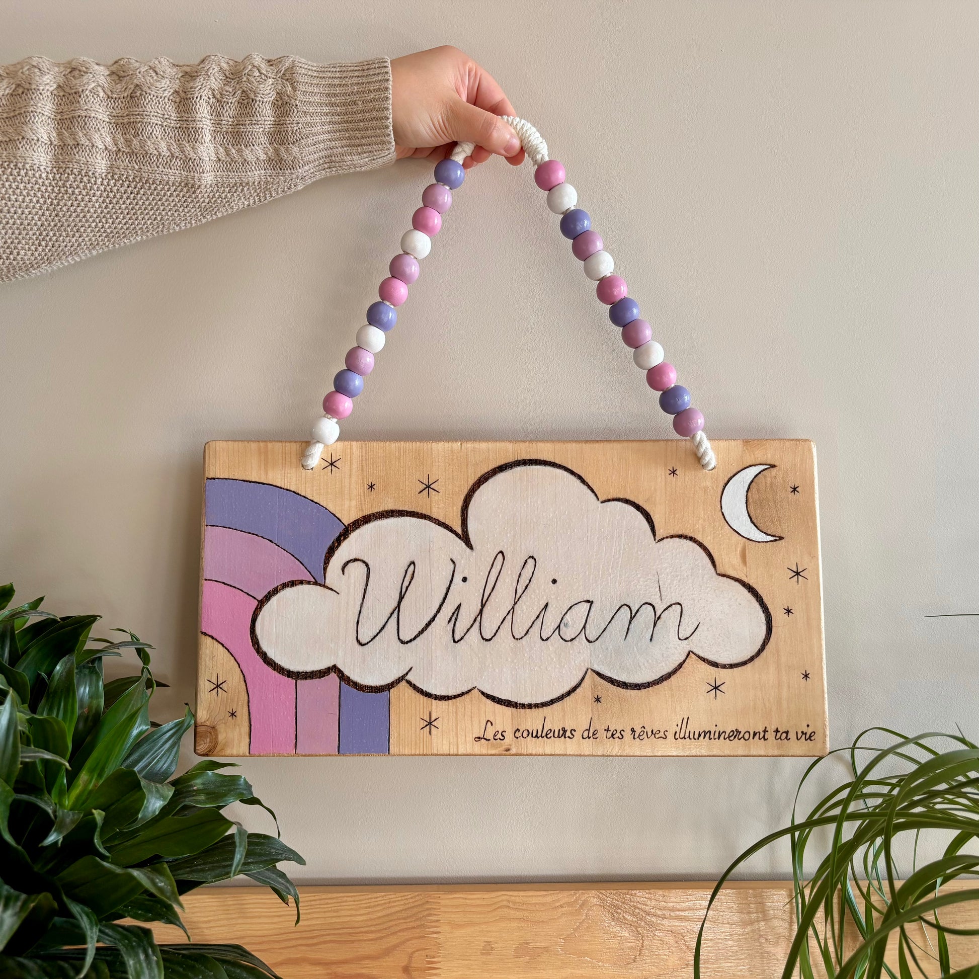 Pancarte en bois pyrogravée, peinte et finie à la main