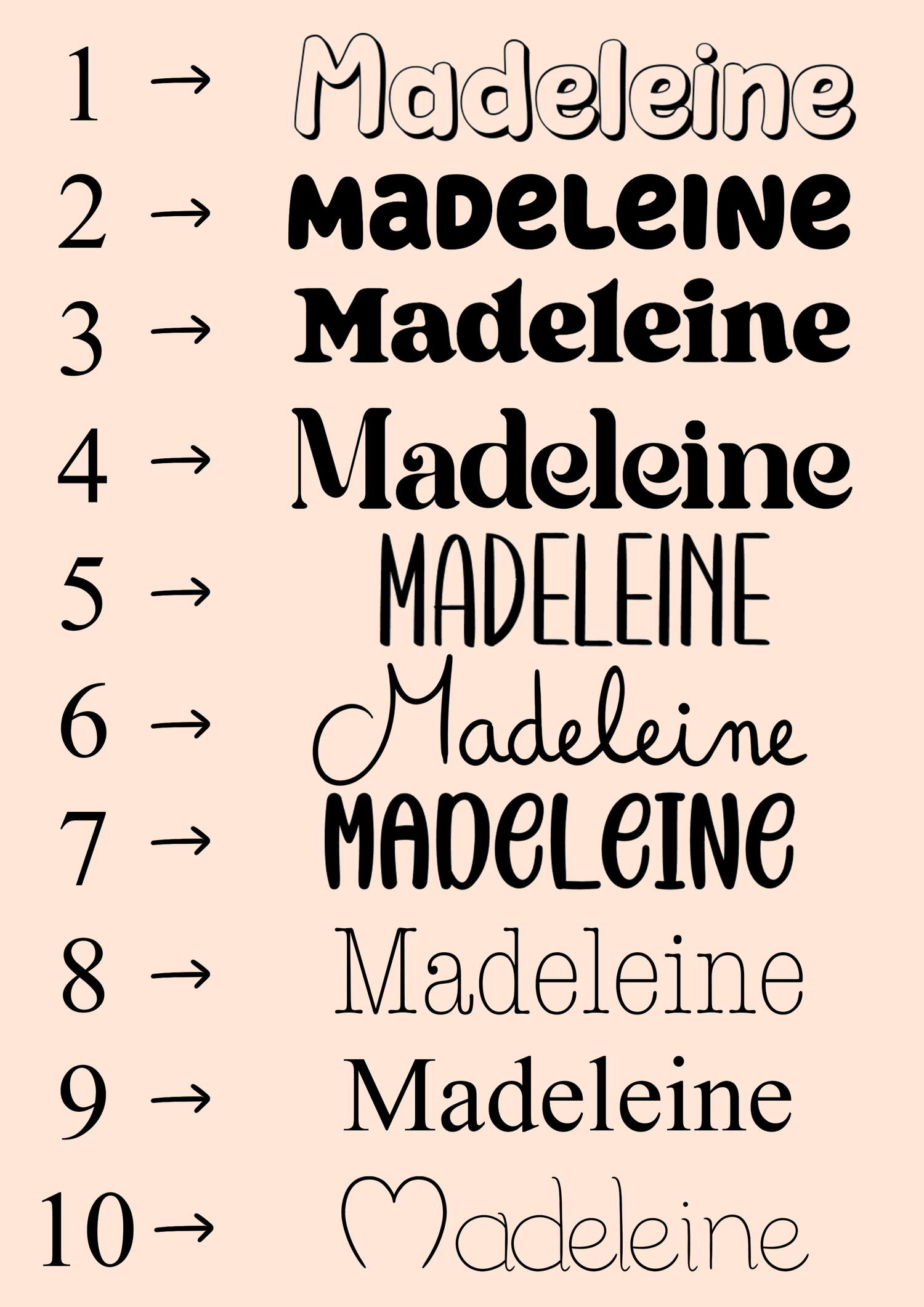 Le prénom reste l'élément central de votre pancarte. Mettez-le en valeur grâce à une police d'écriture qui correspond au mieux à l'univers de votre thème !