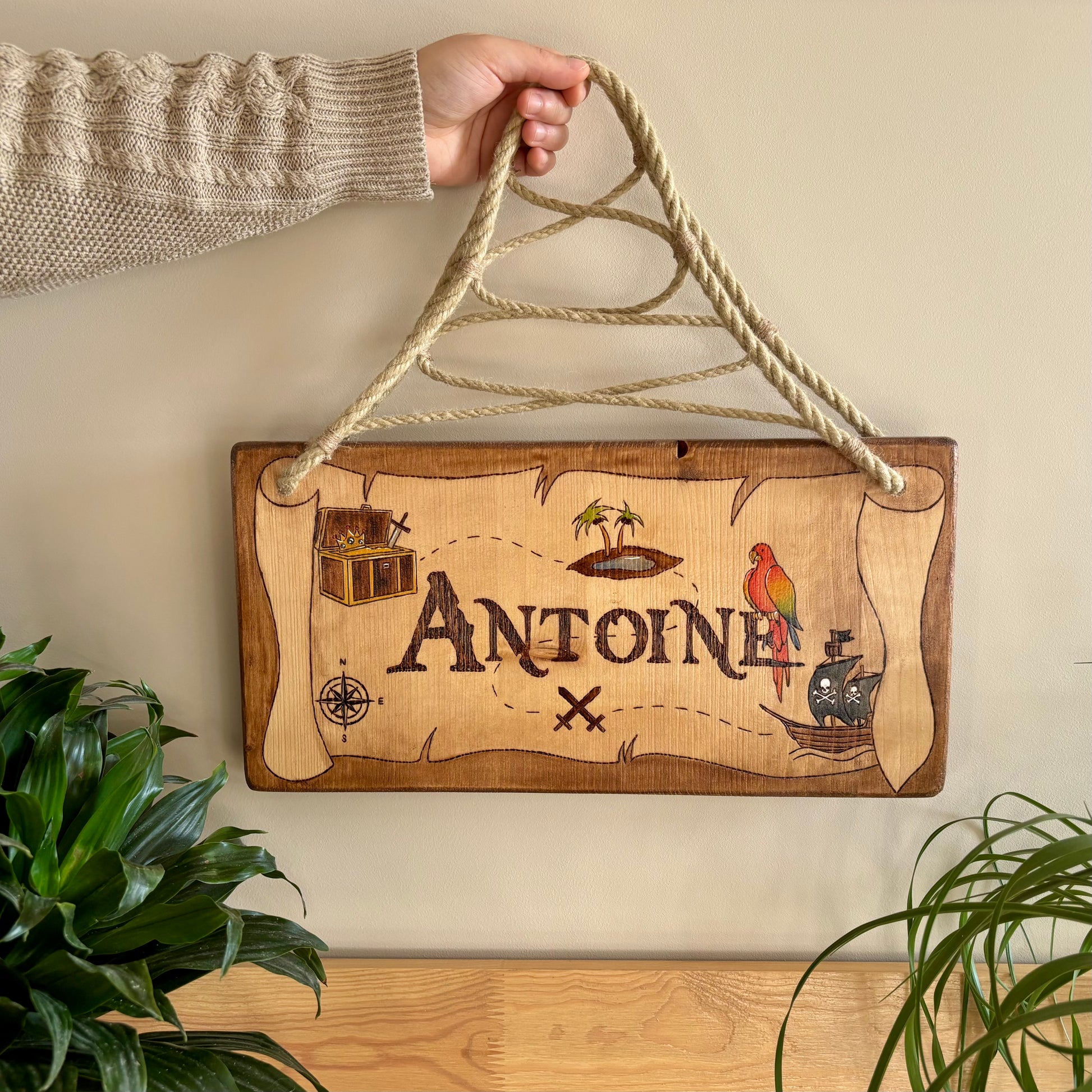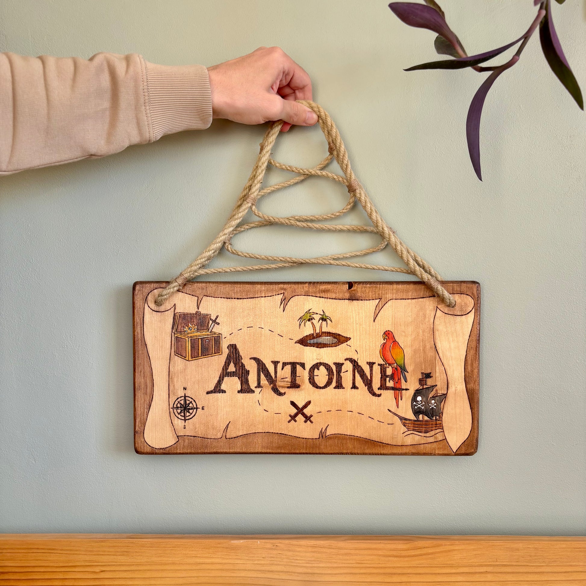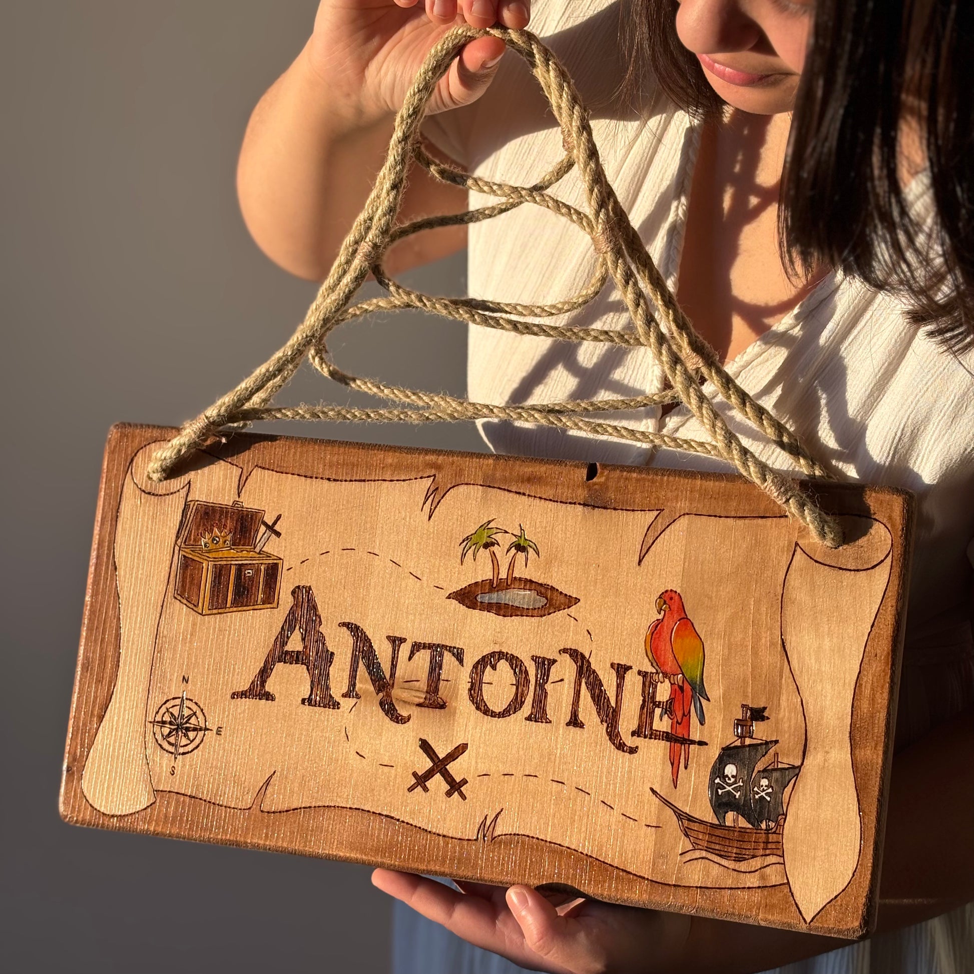 Pancarte en bois pyrogravée, peinte et finie à la main