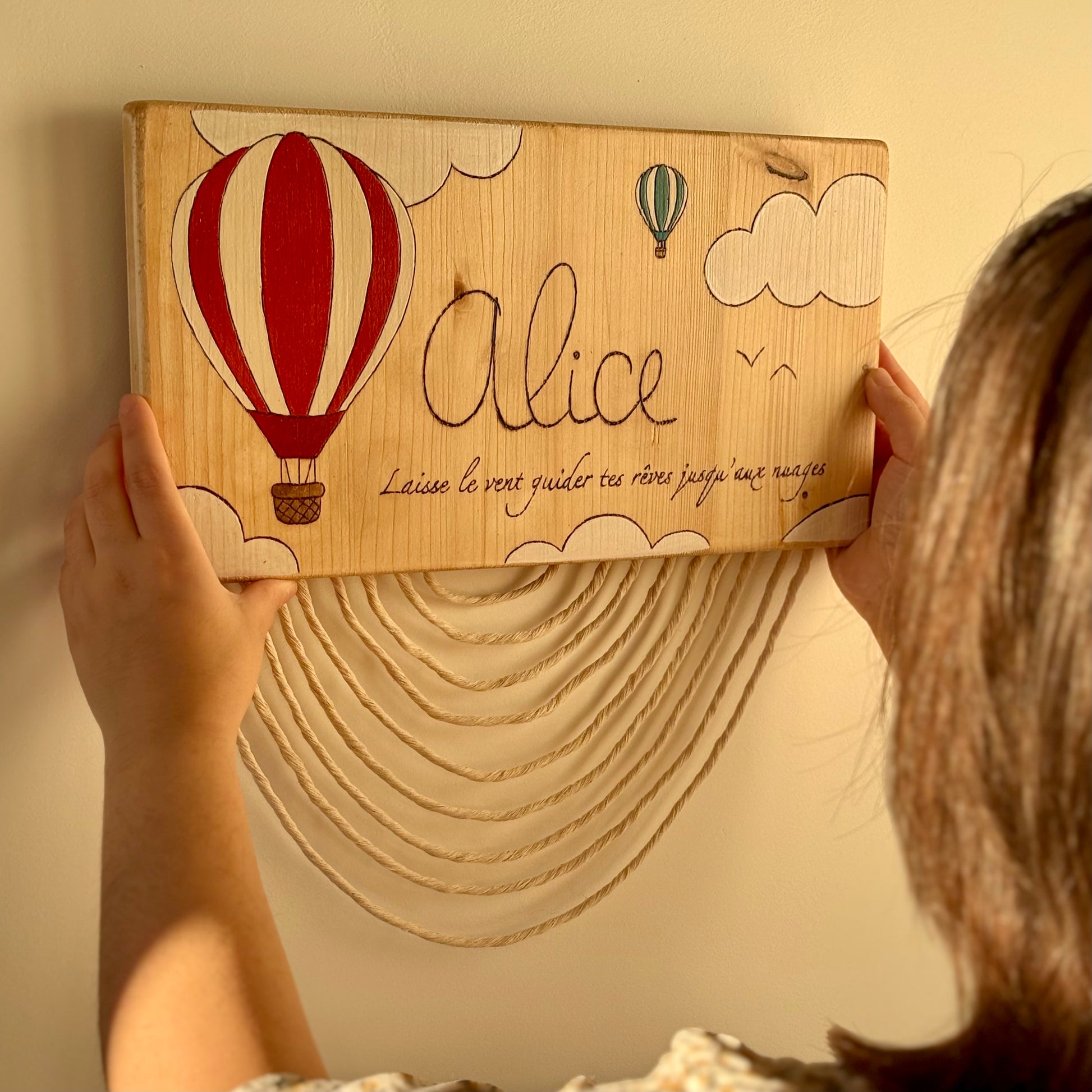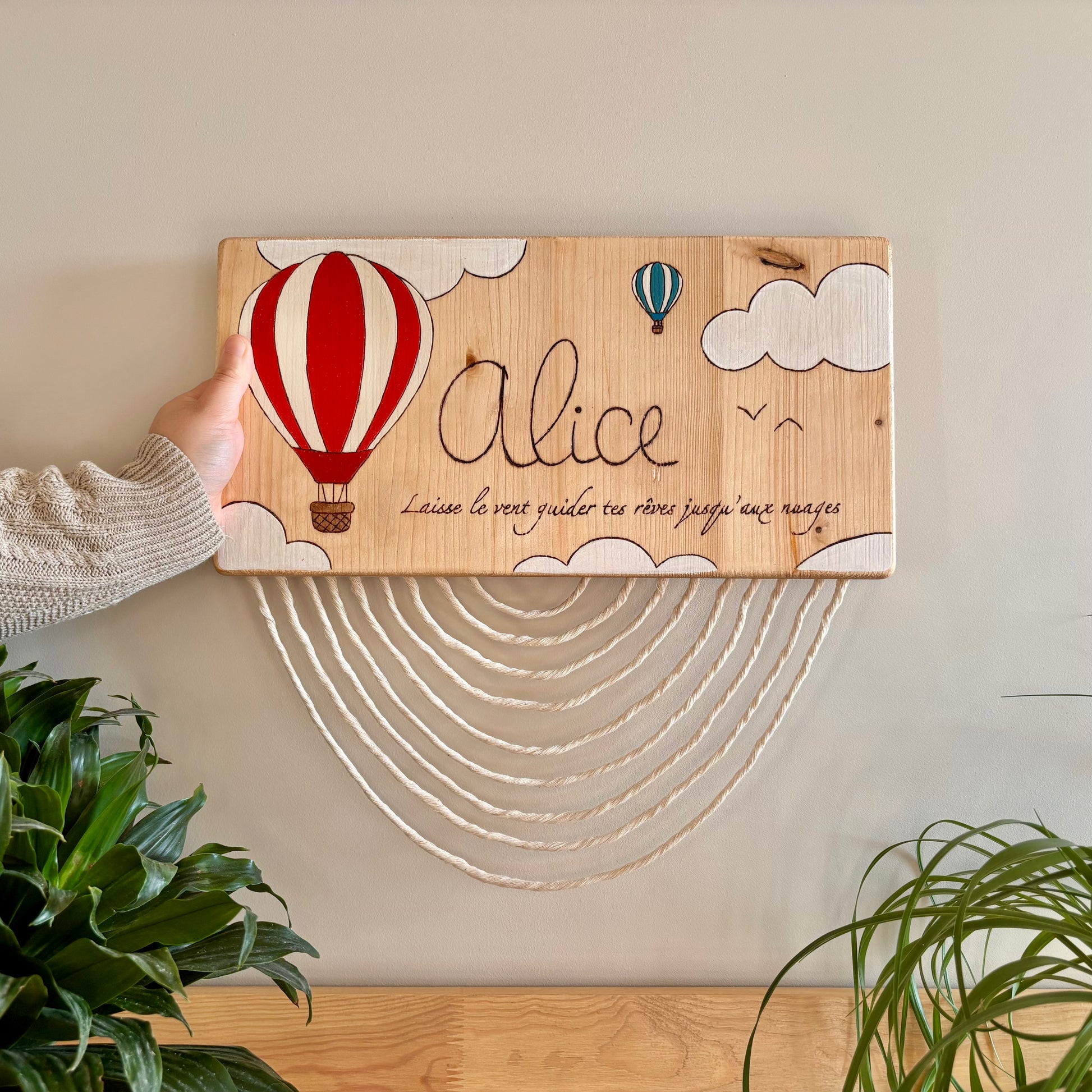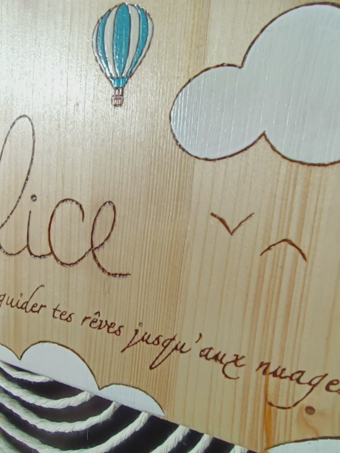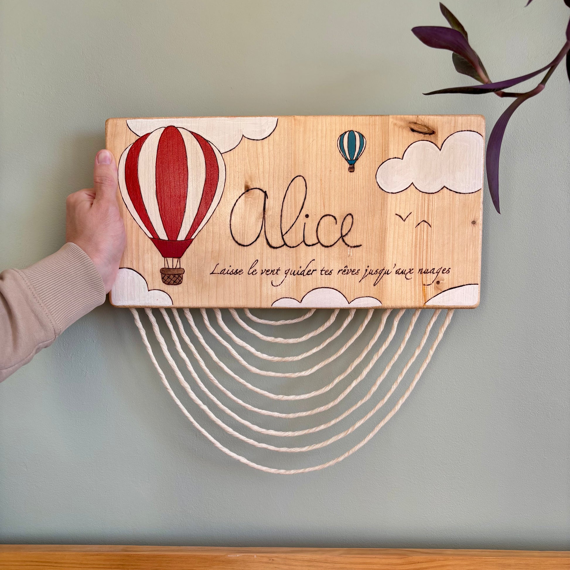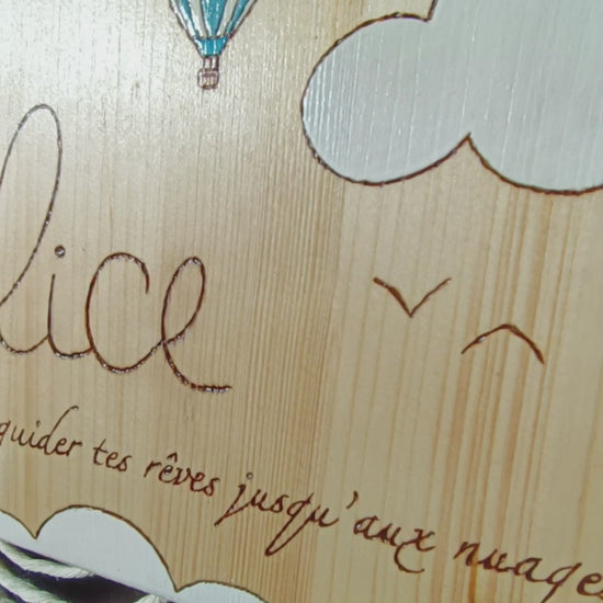 Pancarte en bois pyrogravée, peinte et finie à la main