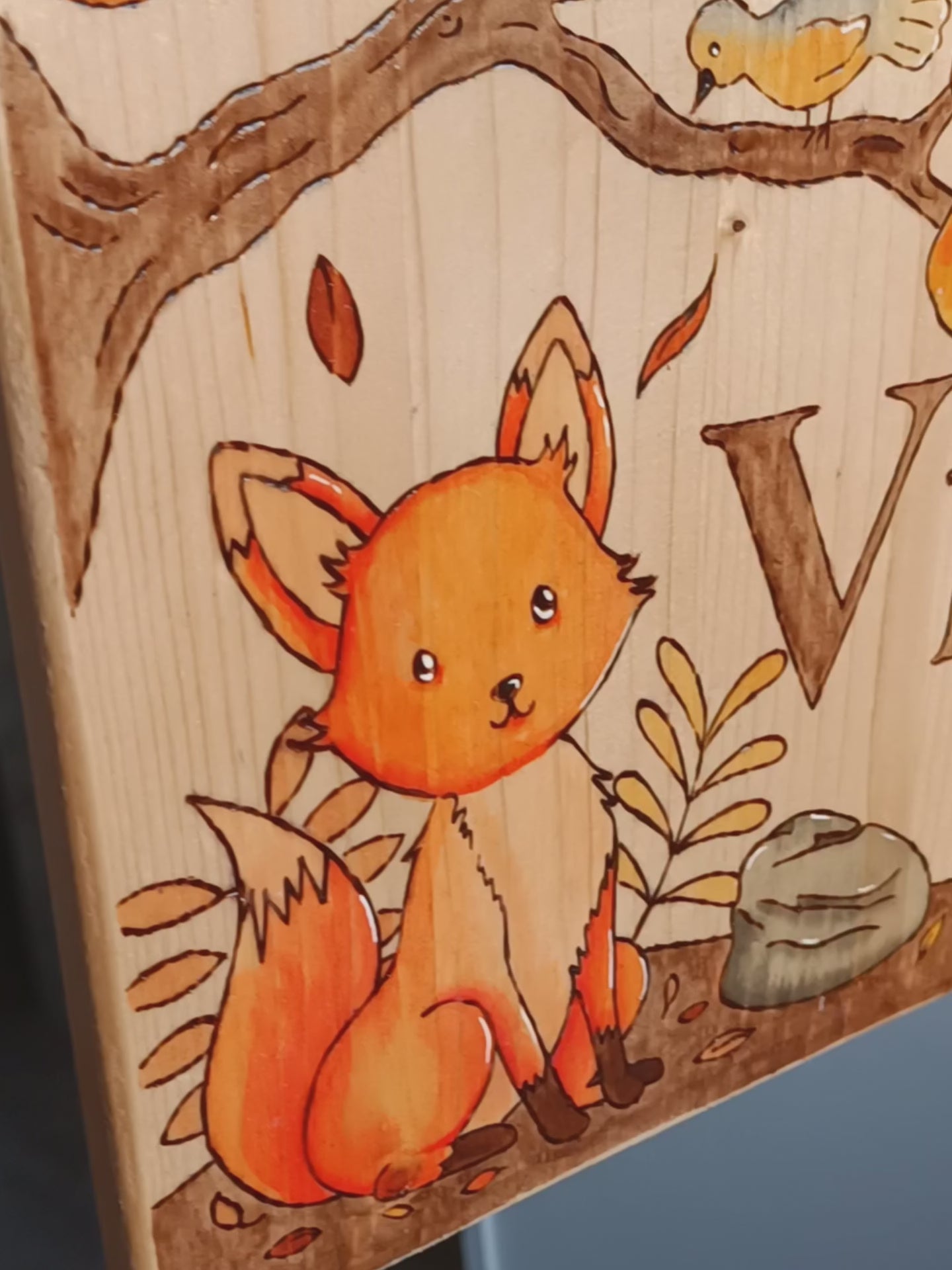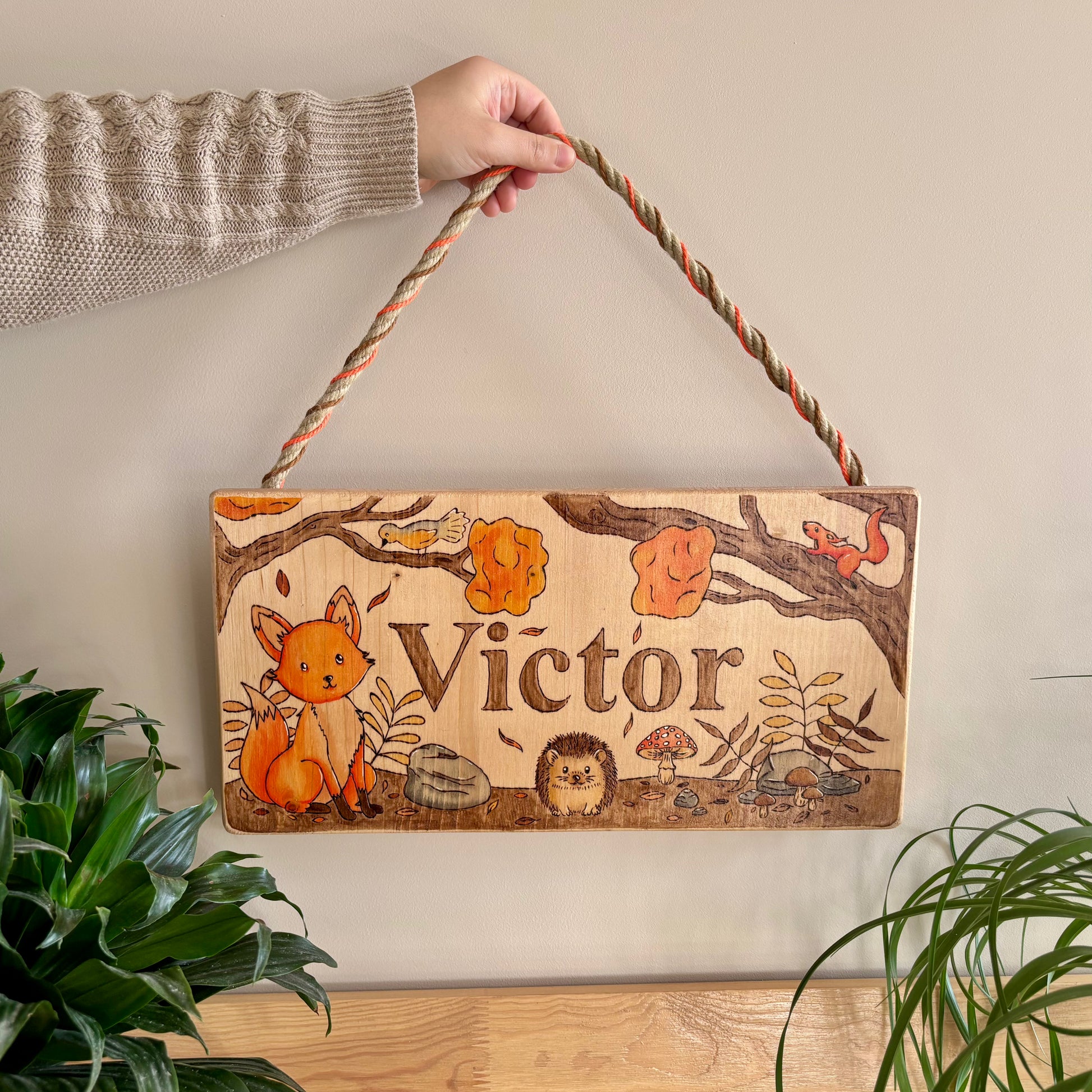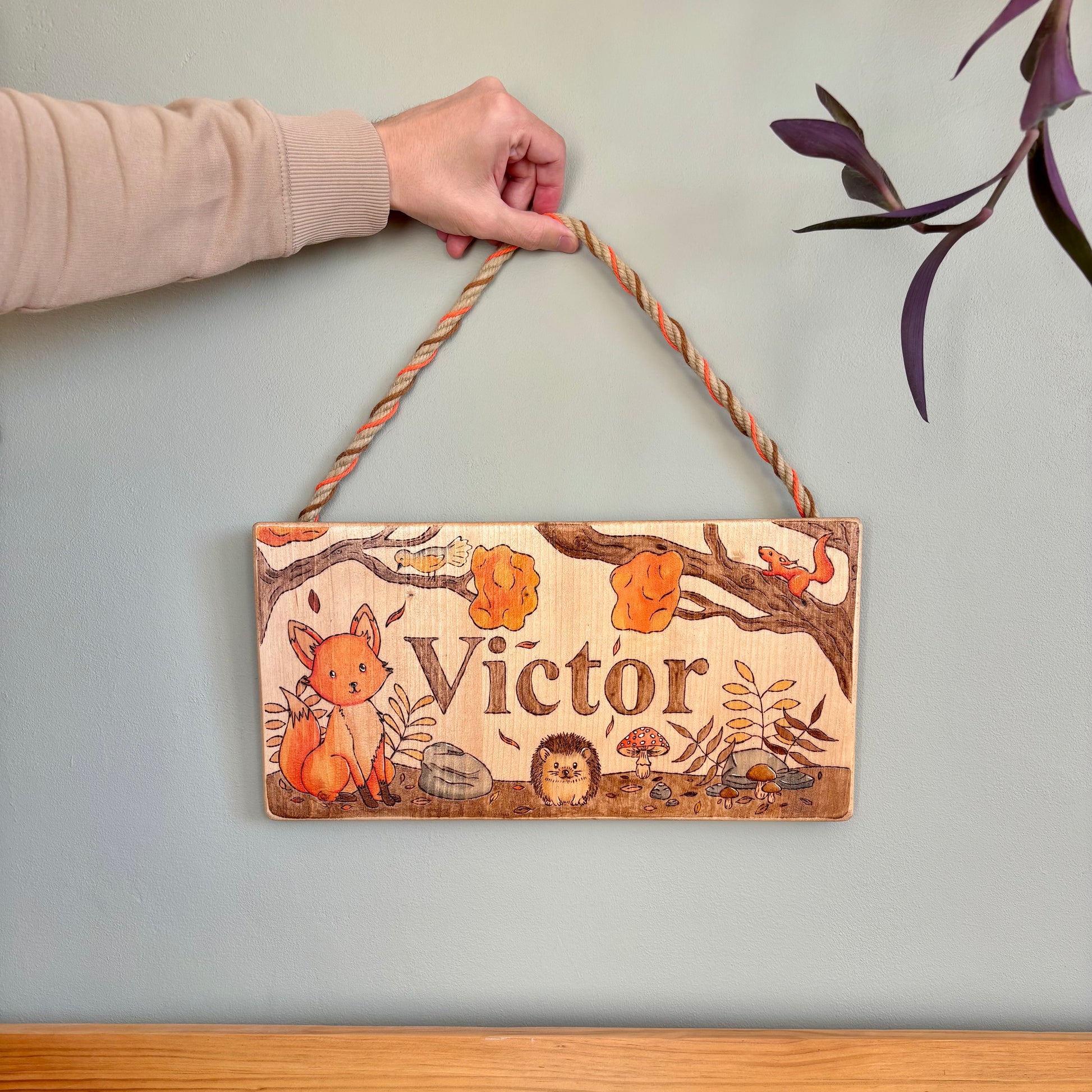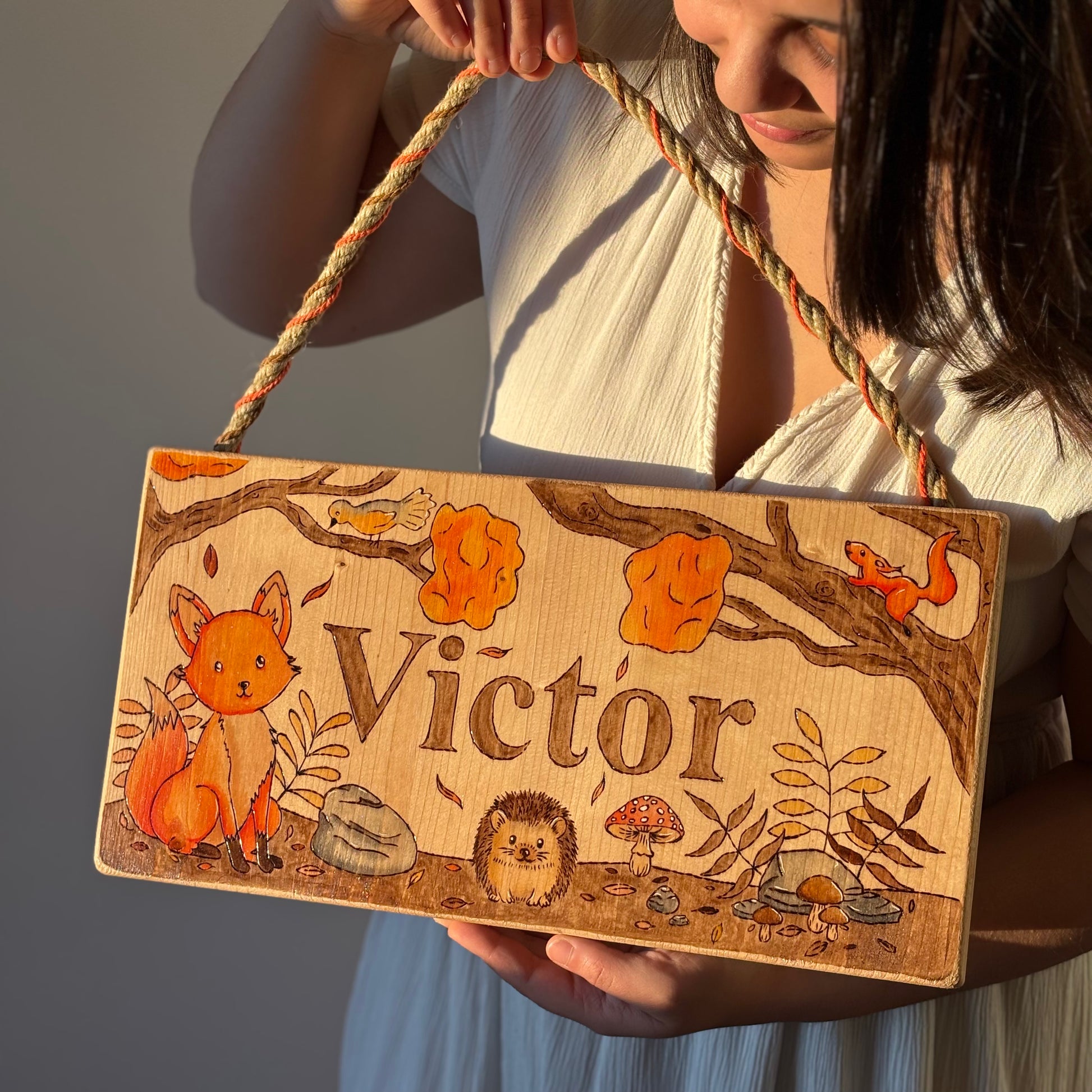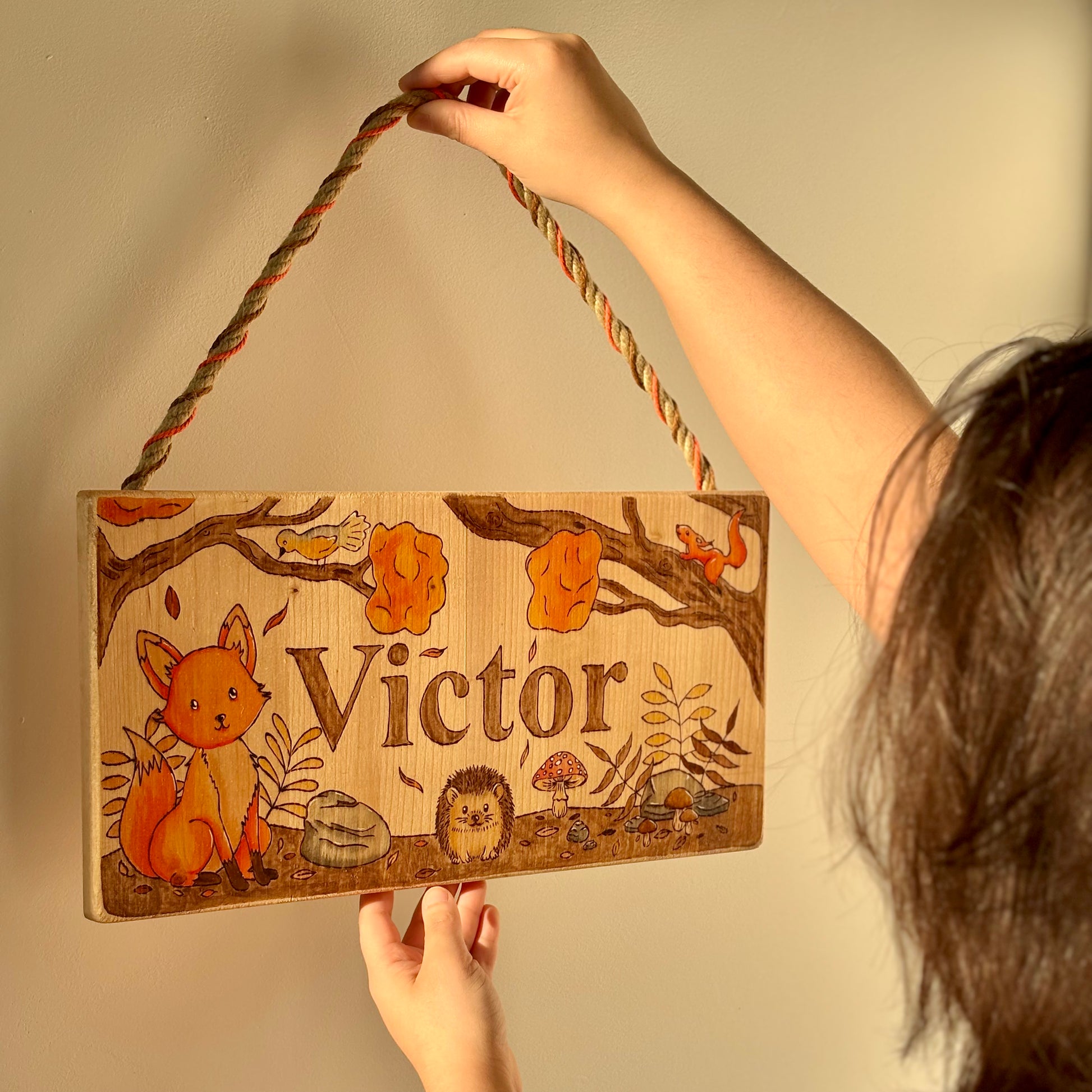 Pancarte en bois pyrogravée, peinte et finie à la main