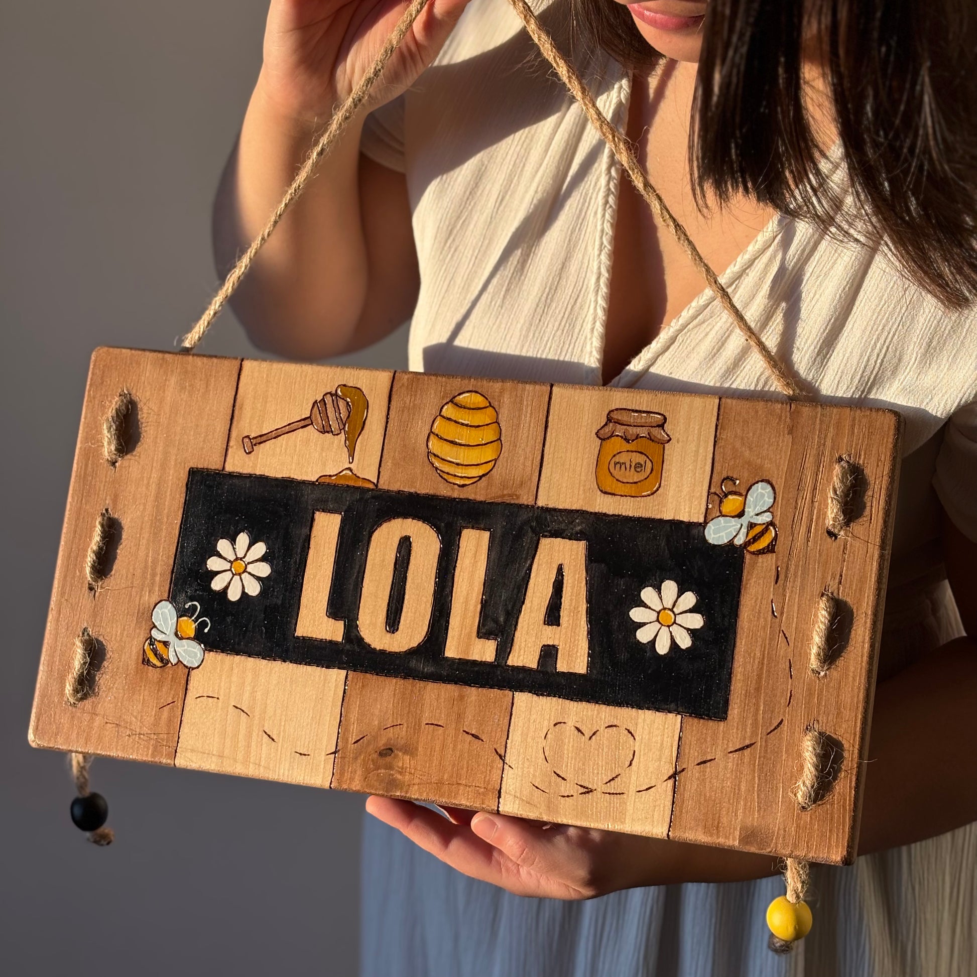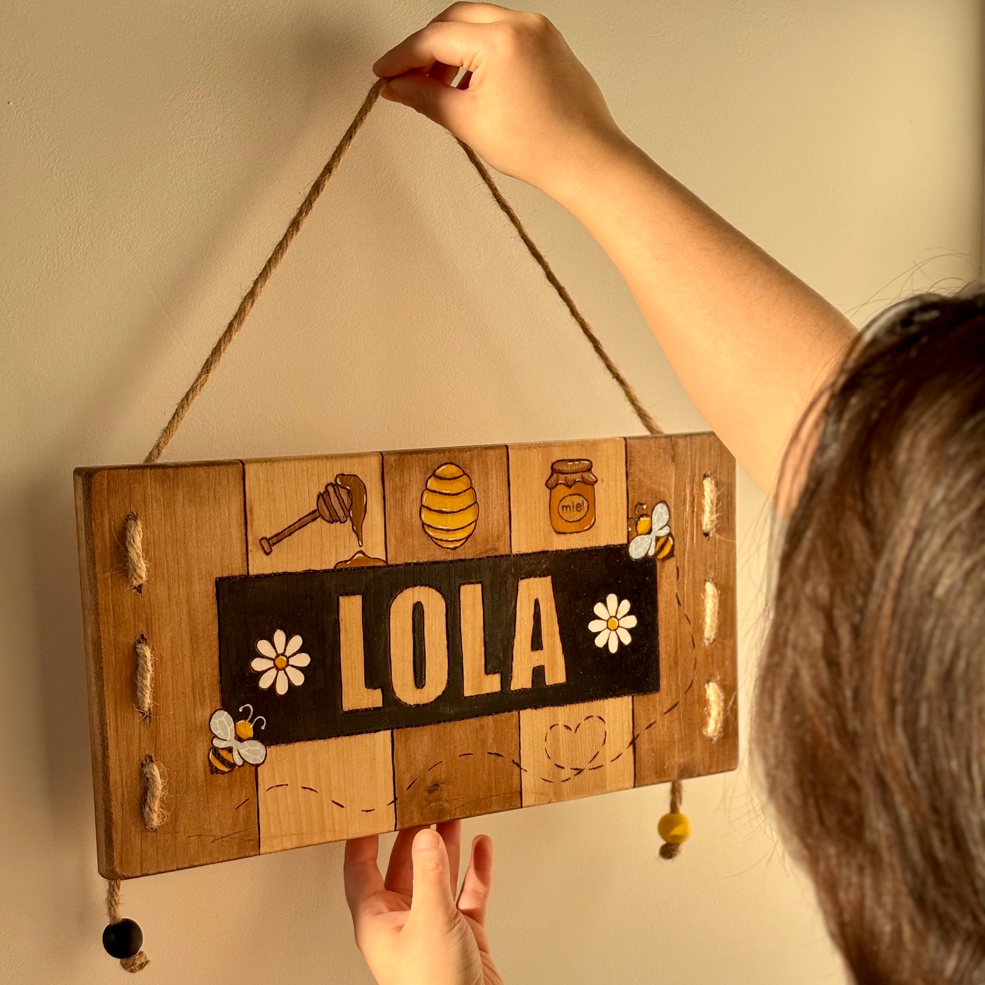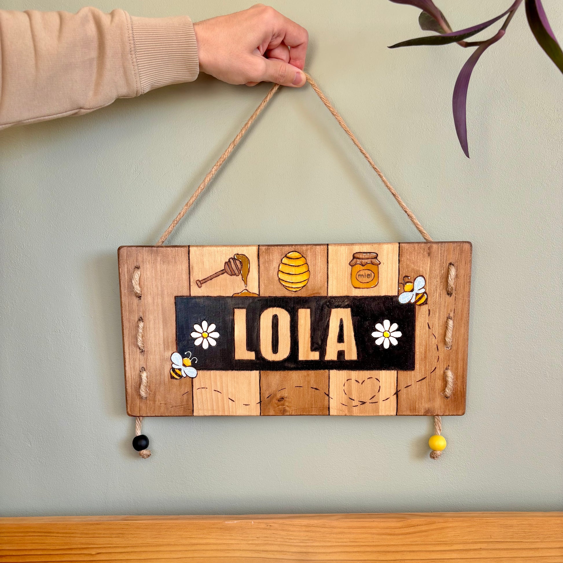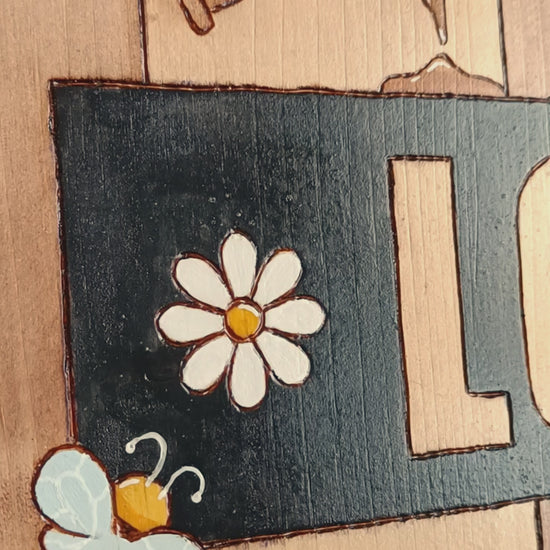 Pancarte en bois pyrogravée, peinte et finie à la main